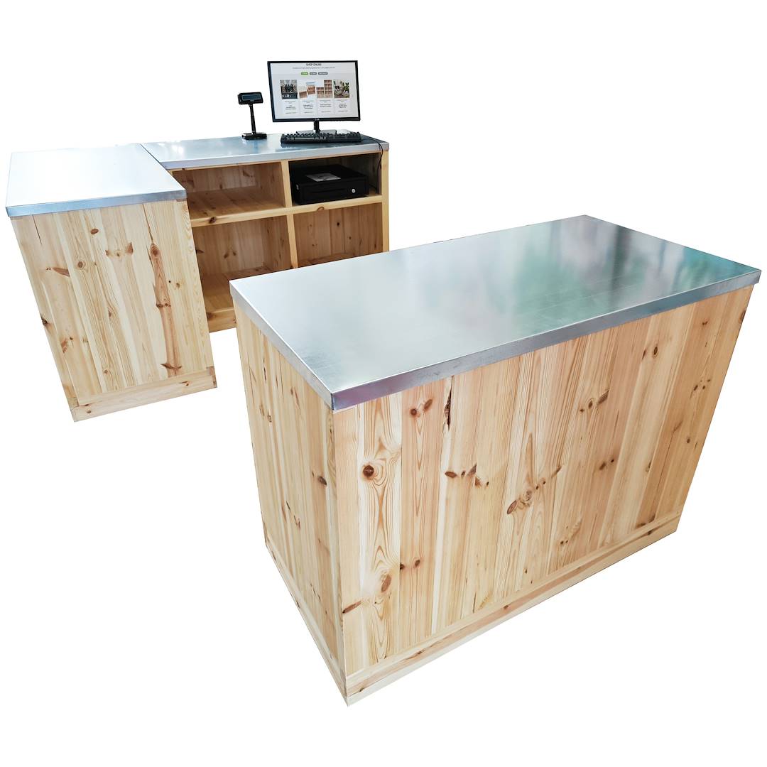 Zestaw kasowy, zaprojektowany z myślą o połączeniu estetyki, funkcjonalności i praktyczności, składa się z trzech modułów o wymiarach 120x60x(wys.)90 cm, wykonanych z naturalnego drewna z trwałym, ocynkowanym blatem. Modułowa konfiguracja pozwala na dostosowanie rozwiązań do indywidualnych potrzeb klientów: